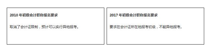 2017年初级会计职称考试要求有会计证才能报考,同时必须在会计证所在地报考。如果无法在所在地报名初级,需要办理会计证调转。2018年既然已经取消了会计证的限制,那么就没有了要在会计证所在地报考的要求了。所以2018年初级考试预计可以异地报考,对于大家报名初级就方便多了。