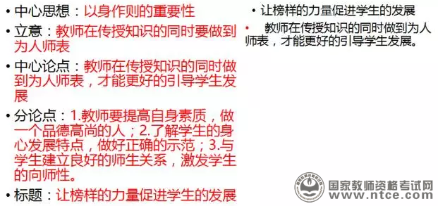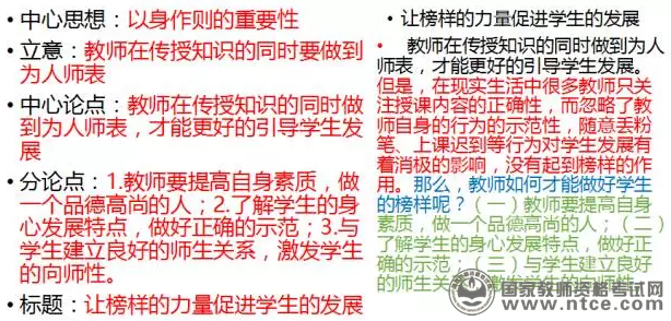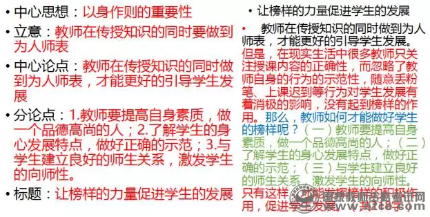 那么分论点行文的第一句应该是:教师是学生的榜样,在学生发展过程中起着示范性的作用。