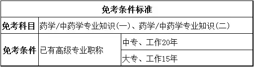 按照国家有关规定评聘为高级专业技术职务,并具备下列条件之一者,可免试药学(或中药学)专业知识(一)、药学(或中药学)专业知识(二)两个科目,只参加药事管理与法规、药学(或中药学)综合知识与技能两个科目的考试: